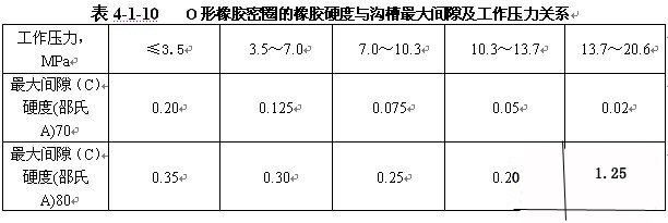 在橡膠材料標(biāo)準(zhǔn)中,以硬度和壓縮永久變形兩項性能最為主重。選擇壓縮變形較小的橡膠材料對密封性能是有利的,而硬度對于O形橡膠密封圈耐壓和抗擠又是至關(guān)重要的。根據(jù)國內(nèi)標(biāo)準(zhǔn)和實踐經(jīng)驗,橡膠在規(guī)定溫度下的壓縮永久變形最大不超過50%。而橡膠的硬度與密封工作壓力密切相關(guān),壓力越高,硬度也是越高;參見表4-1-11