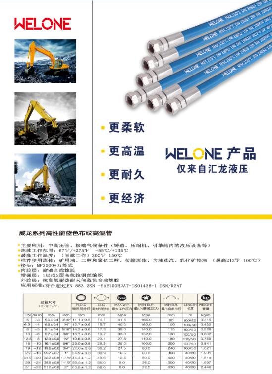 藍色棉線高溫管壓力符合及超越SAE標準·耐溫度范圍更大·具備突出的持續(xù)性耐高溫和抗紫外線特點,廣泛用于工程機械等行業(yè)。