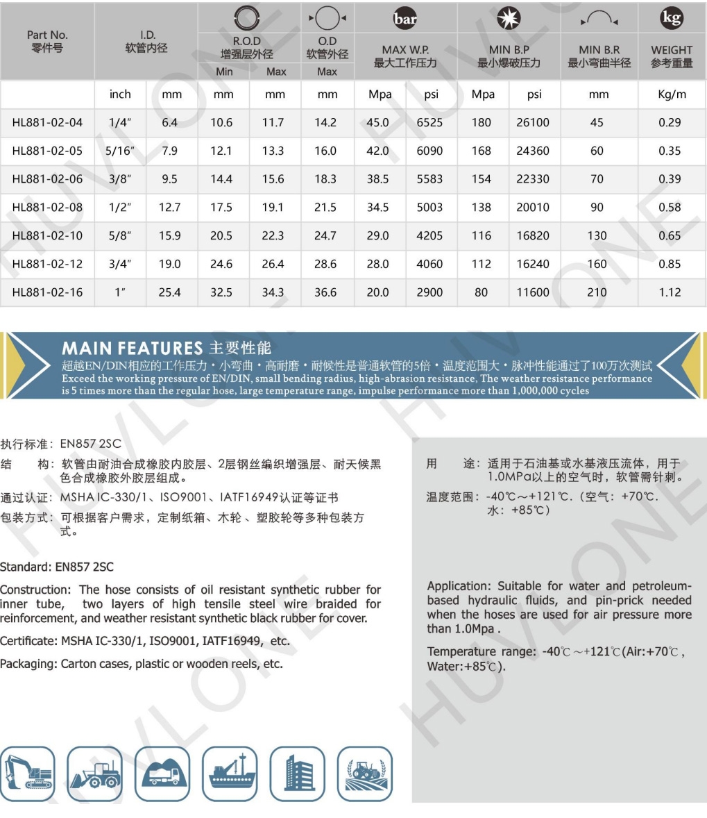 Meet/Exceed the standard of DIN EN857 2SC Two steel wires braided rubber hydraulic hose
