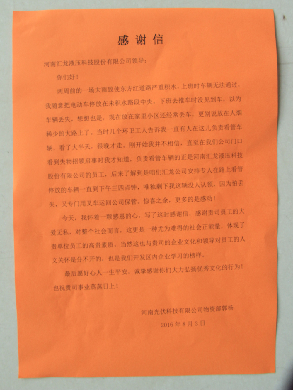 8月2日,協(xié)鑫的兩名員工來到我公司認(rèn)領(lǐng)電動車,電動車主人為協(xié)鑫物資部郭楊,郭楊說,她幾乎已經(jīng)放棄了尋找電動車的希望,并把電動車防盜鎖的鑰匙都給扔了。8月3日上午,我公司設(shè)備部員工幫忙將電動車的鎖打開,郭楊高高興興地推走了電動車。下午,郭楊又同協(xié)鑫行政部、供應(yīng)部、采購部的幾名人員前來我公司進(jìn)行感謝,并帶來了一封感謝信。